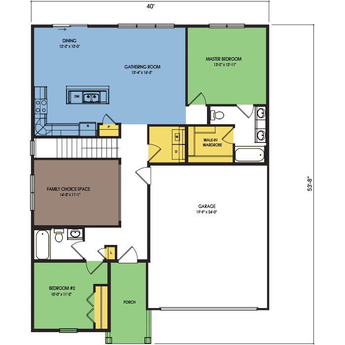 A part of our dream series, the tamarack floor plan features 3 bedrooms and 1.5 bathrooms with a foot print of 44x30 feet and 1342 total square feet of living space.