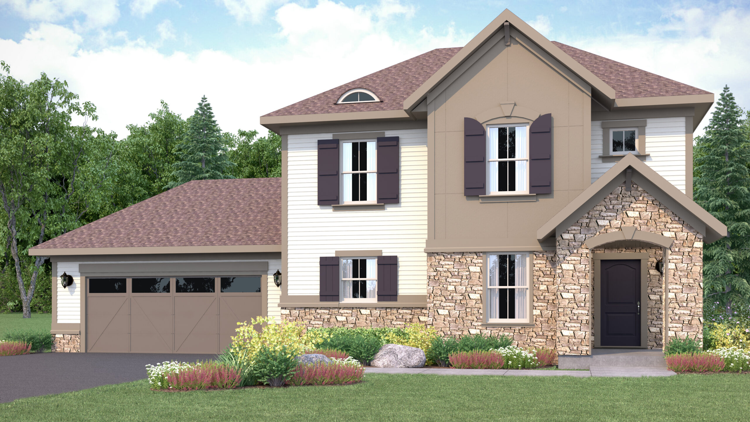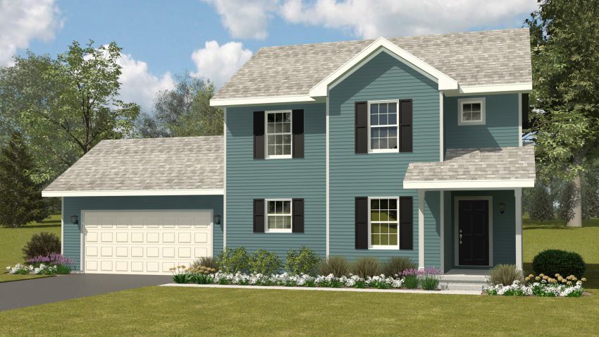 Exterior rendering of Mulberry floor plan, traditional exterior style. 3 bed/2.5 bath. Traditional