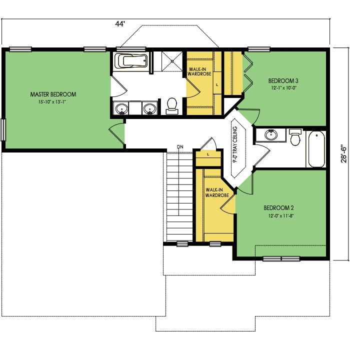 A part of our dream series, the tamarack floor plan features 3 bedrooms and 1.5 bathrooms with a foot print of 44x30 feet and 1342 total square feet of living space.