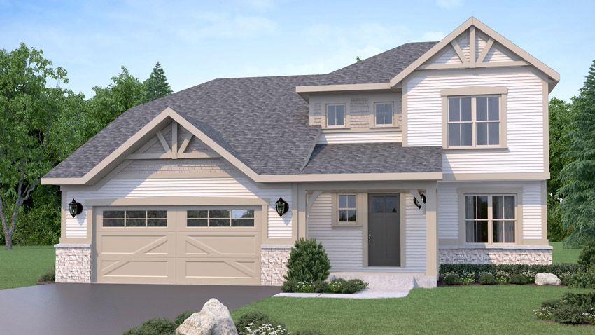 Exterior rendering of Quaking Aspen floor plan from the front. European exterior style. 3 bed/2.5 bath. European